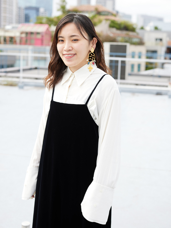 「印象的なゴールドのアクセサリーを活かす、モノトーンの着こなしを選びました。落ち感のあるブラウスにベロアのワンピースをレイヤードすることでウェアはシックな着こなしが遊び心のあるアクセサリーのデザインを引き立てます。」