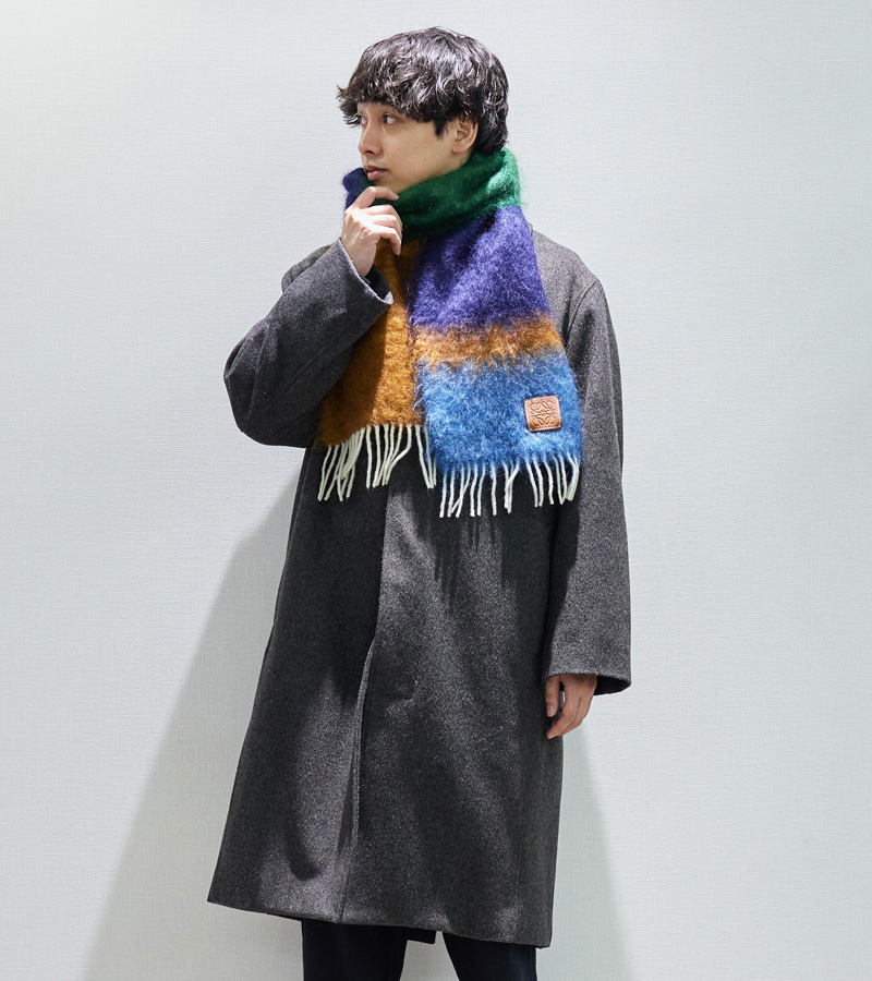 冬小物といえば、マフラーを思い浮かべる方が多いのではないでしょうか。ファッションとして取り入れるならモヘア素材がおすすめです。毛足が長く、柔らかい手触りが特徴。コートの上から巻くだけで、こなれ感を演出してくれます。今回は、[ロエベ]のモヘアマフラーをピックアップ。数年前から多くのファッションラバーから注目されていて、コーディネートのアクセントになること間違いなしです。シーズンによって、単色やビビットなカラーリングなど、豊富なデザインもつい集めたくなりますね。他にも、シンプルな無地のウール素材であれば通勤・通学にも使いやすいですし、ファッションに合わせて柄物やダウンマフラーもおすすめです。
