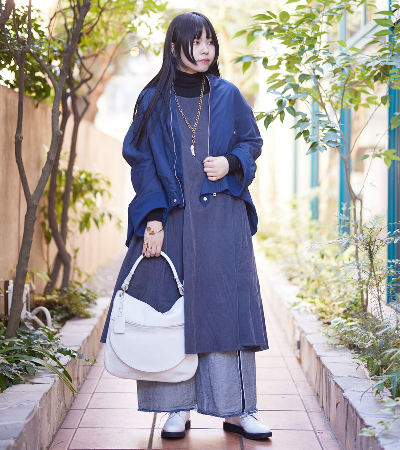 合わせるアイテムによって季節を通して楽しめるノースリーブやキャミソールタイプのワンピース。[エッグ]のコーディロイワンピースをデニムパンツでレイヤード。寒いうちはタートルネックのニットがぴったりですが、トレンドのシアートップスやブラウスなどインナー次第でスタイリングの幅が広がります。今回はワンピースの色に合わせて他のアイテムの色もダークトーンでまとめつつ、バッグとシューズは白で統一して重くなりすぎないようにしました。小物はデザイン性のあるものを入れて遊び心も忘れずに。