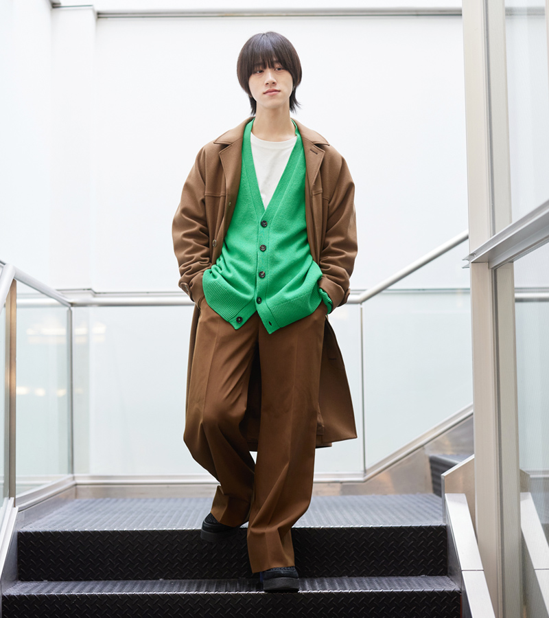 グリーン×ブラウンのモードスタイルを組みました。どちらもアースカラーなので、相性がよく、こなれた雰囲気を演出できます。今回は、グリーンの火付け役でもある、[ボッテガヴェネタ]のニットをピックアップ。一見、合わせるのが難しそうな色味ですが、ダークトーンを合わせることで、落ち着いた着こなしができます。落ち感のあるドレープがきれいなコートとパンツを合わせて、ラグジュアリーな印象にしました。春先でも、薄手のニットなら、ライトアウターのレイヤードとして着用できるので、ぜひこの春取り入れてみてください。