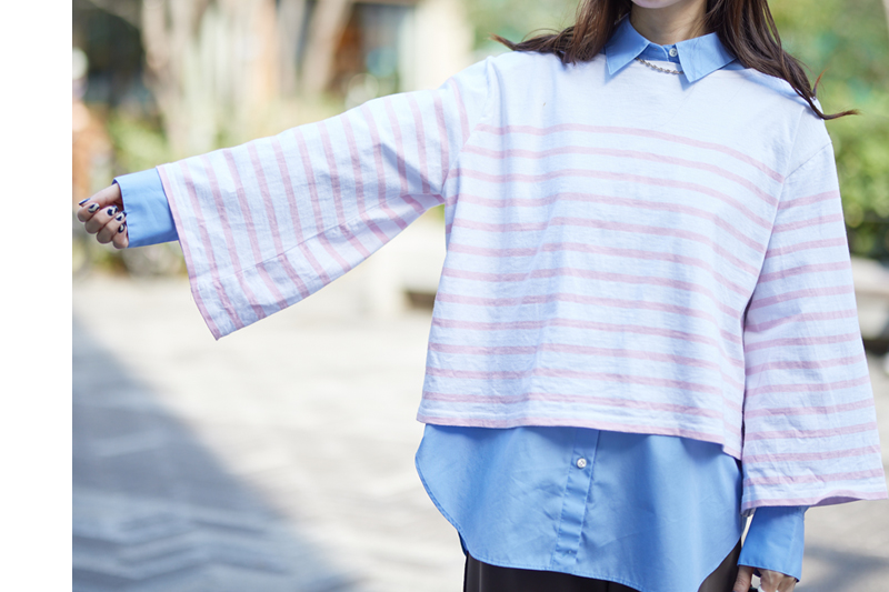 [オーシバル][セントジェームズ]と並んで「世界三大ボーダー」として人気の高いフランス発の[ルミノア]のバスクシャツは、さらっとした肌触りの軽くて柔らかい生地が特徴です。今回着たバスクシャツの魅力は何といってもピンクの春らしいカラーと、ゆったりとした身幅に短めの丈、そしてゆるく広がるベルスリーブ。そのシルエットを活かして、サックスブルーのシャツをレイヤードしました。肌寒い日は薄手のタートルネックのカットソーを重ねたり、また逆にバスクシャツをインナーとして上からシャツを羽織ったり、主張が強すぎないからこそ着回しがきいて春夏にとても重宝するトップスです。