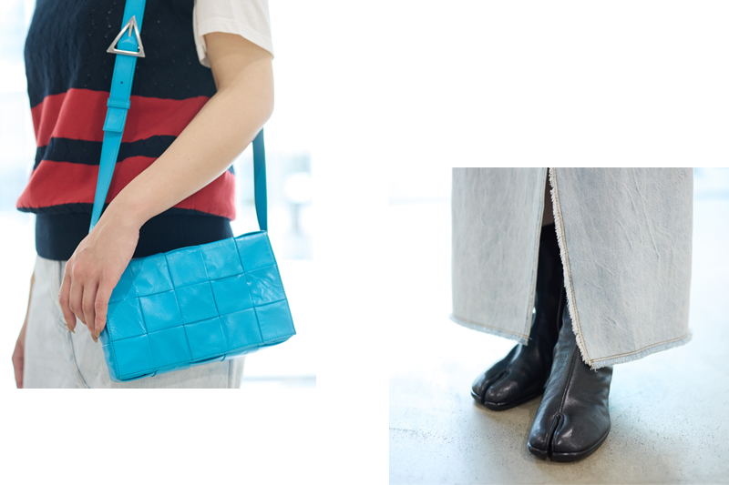 Tシャツなどを一枚で着るワンツーコーデが多くなりがちな夏こそ、レイヤードで差がつくシーズン。キャミソールやノースリーブタイプのニットをレイヤードさせるだけで、いつもの着こなしがブラッシュアップ。こちらは、フロントのラインディテールが目を惹く[ナマチェコ]のニットベスト。シンプルなTシャツをオンするだけで旬なレイヤードスタイルが完成。ボトムスにはデニムスカートをチョイス。薄いカラーのスリットが入ったデザインなのでロング丈でも重たくならず、さらに縦長のIシルエットでスタイルアップ効果を発揮しトップスともグットバランス。引き締め役の黒のブーツと発色の良いバッグでキレ良く仕上げて、大人なモードスタイルへ昇華。