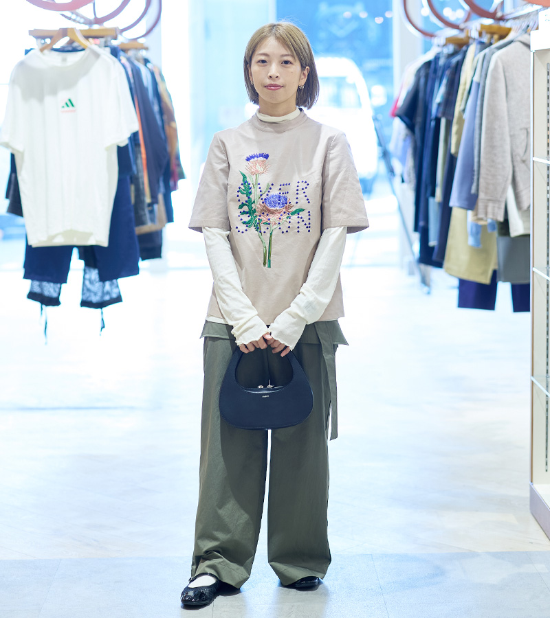 レザーというと、まずはブラックを思い浮かべてしまいがちですが、[アキラ ナカ]のトップスはそれを覆すとても軽やかなカラーリング。柔らかいフェイクレザーとベージュのカラーがレザーのハードなイメージを一新。フロントのカラフルな刺繍もレザーアイテムには珍しい特別感があります。小物はブラックのレザーで統一感を持たせつつ、コーデの引き締め役に。ボトムはカーゴパンツを合わせて、日常に溶け込む、気張らないスタリングに仕上げました。