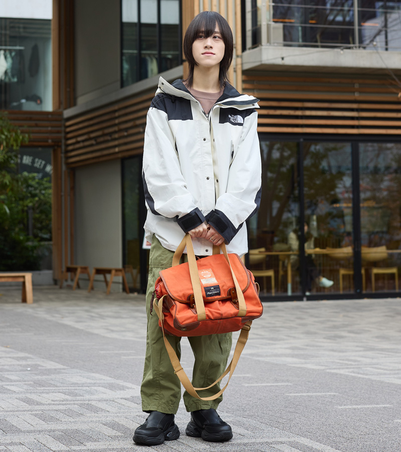アウトドアブランドの代表格である[ザ ノース フェイス]のブルゾンは、機能性とデザイン性を高次元で両立した一着。軽量で動きやすく、急な天候変化にも対応できる実用性を備えながら、クリーンな配色と無駄のないディテールが都会的な印象を演出します。インナーにはくすみカラーのスウェットを合わせ、パンツはミリタリー要素のあるアイテムをセレクト。程よく力の抜けたカジュアル感をプラスしました。差し色として効かせた鮮やかなオレンジのバッグが視線を集め、全体のトーンを引き上げるアクセントに。街と自然を軽やかに行き来する、現代的なブルゾンスタイルです。