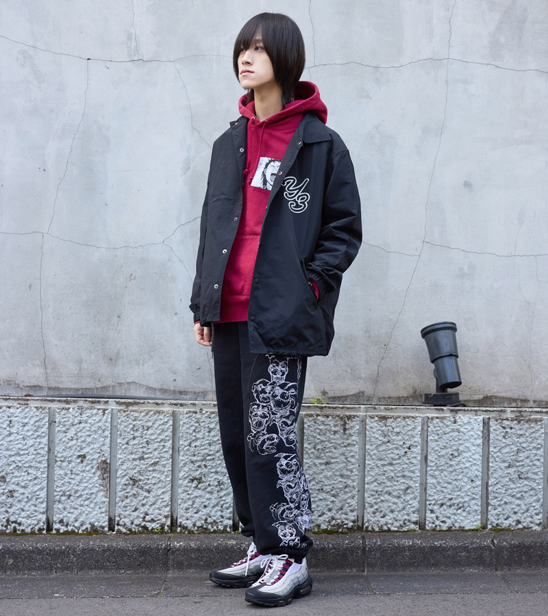 [ワイスリー]のブルゾンは、スポーツウェアの機能性と[ヨウジヤマモト]ならではのモード感覚を融合させた一着。軽量で動きやすく、日常使いしやすい実用性も魅力です。インナーにはアクセントカラーのフーディを合わせ、ストリート感を程よくプラスしたレイヤードに。ボトムにはグラフィックが映えるパンツを選び、シンプルなブルゾンとのコントラストを効かせています。足元はボリュームのあるスニーカーで全体を引き締め、スポーティさと前衛性が共存する、[ワイスリー]らしい都会的なスタイリングに仕上げました。