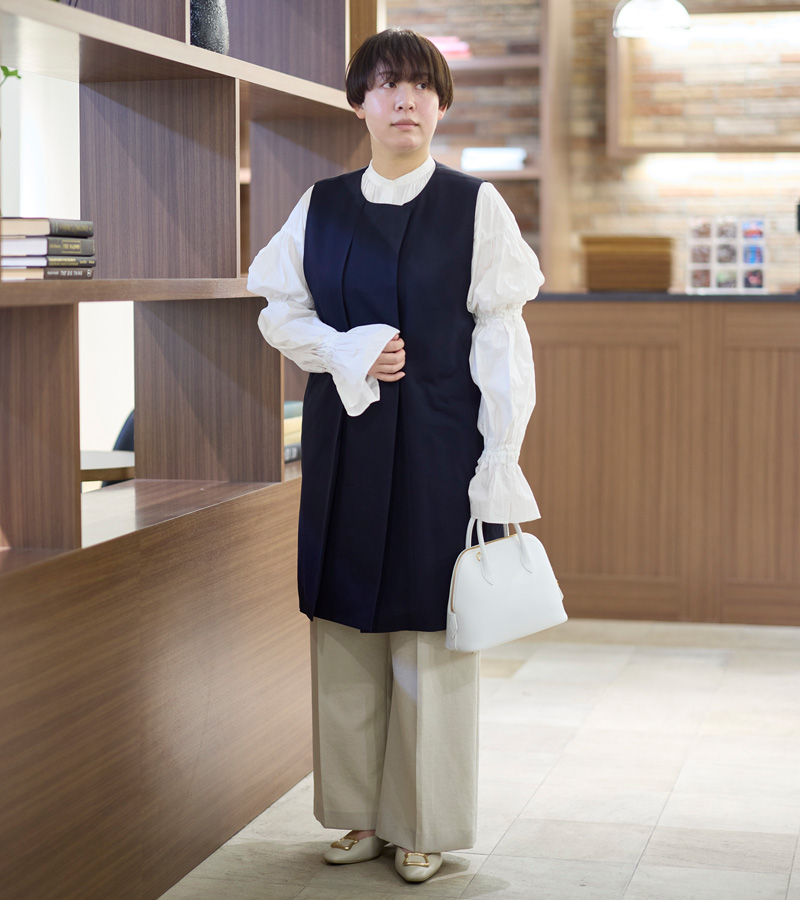 ジャケット選びで、マニッシュになりすぎるのが苦手という人には、ノーカラーがおすすめ。ノーカラーのジャケットは襟付きよりも柔らかい印象になり、女性らしい着こなしが叶います。定番のツイードジャケットも人気ですが、今回はベストを使ったスタイリングに注目!汎用性が高いので、フォーマルでも普段使いにも対応できるきちんと服です。ポイントはインナー選び。襟元や袖は存在感のあるものを選ぶとコーデがグッと華やかに。[バジーレ28]のベストに合わせた[エンフォルド]のコットンのブラウスは、ボリューム感たっぷりの袖のシャーリングが存在感を発揮してくれます。他のアイテムも優しい印象のホワイト、ベージュトーンで統一。きちんと感の中にも今っぽさを意識したスタイリングです。