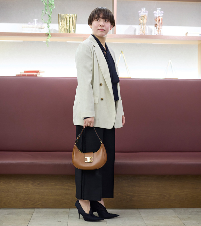 [リヴドロワ]のジャケットは、薄いベージュが春らしい優しい印象の一着。ダブルでもかっちりしすぎない柔らかい風合いなので、カジュアルからオケージョンまで幅広く着まわせます。今回は新しいシーズンを意識して、フォーマルにも対応できるスタイリングにしました。インナーにはネイビーの[ドロワー]のブラウスをチョイス。ジョーゼット素材で顔回りにエレガントな華やかさを演出してくれます。足元もシアーな生地使いの[バレンシアガ]のシューズをチョイス。女性らしいヒールでいつもより少し盛りを意識。ボトムは足首の出るキュロットタイプを合わせることで、マニッシュになりすぎないきれいめコーデに仕上げました。