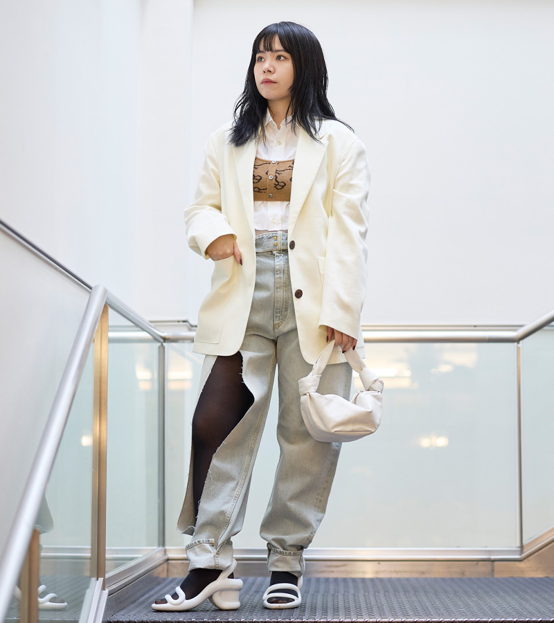 シンプルで使いやすいシングルジャケットは素材もカラーも豊富。その中から春らしさ全開のオフホワイトカラーをチョイス。[スタジオニコルソン]のテーラードジャケットはたっぷりとしたなシルエットで、カジュアルなスタイリングにもマッチ。デニムのパンツは使い勝手がよく、シンプルなものを選びがちですが、今回は遊び心たっぷりのディテールが映える[メゾンマルジェラ]のデニムでモード感を演出。トップスにはトレンド感ある[ロク]のビスチェタイプのニットベストをレイヤードしてコーデのアクセント。[ボッテガヴェネタ]のバッグ、[カンペール]のシューズはホワイトカラーでまとめて、きりっと春のモードカジュアルの完成です。