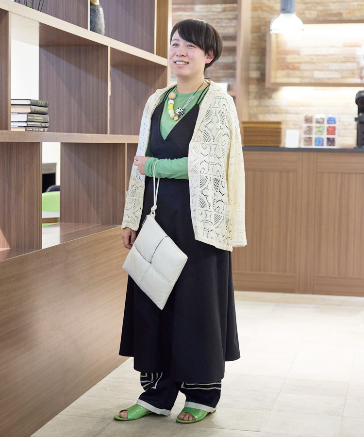 キャミワンピースは、合わせるアイテム次第で印象を自在に変えられる一着。上からニットシャツをレイヤードすることで、きちんと感のある落ち着いたスタイルに仕上げています。モノトーンでシックにまとめた中に、グリーンのインナーとサンダルをアクセントとして取り入れ、さりげない彩りと軽やかさをプラス。オンシーンにも馴染む上品な着こなしです。