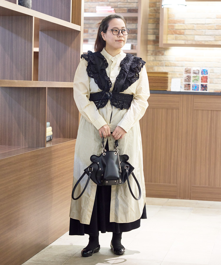 シャツワンピースをフロントクローズで着用し、端正なシルエットを活かしたスタイル。裾から覗くロングスカートがさりげないアクセントとなり、動きのある軽やかな印象を演出します。さらにフリルディテールのビスチェを重ねることで、ほどよい華やかさをプラス。モノトーンで小物を揃え、ナチュラルさの中に洗練された雰囲気を引き立てた着こなしです。