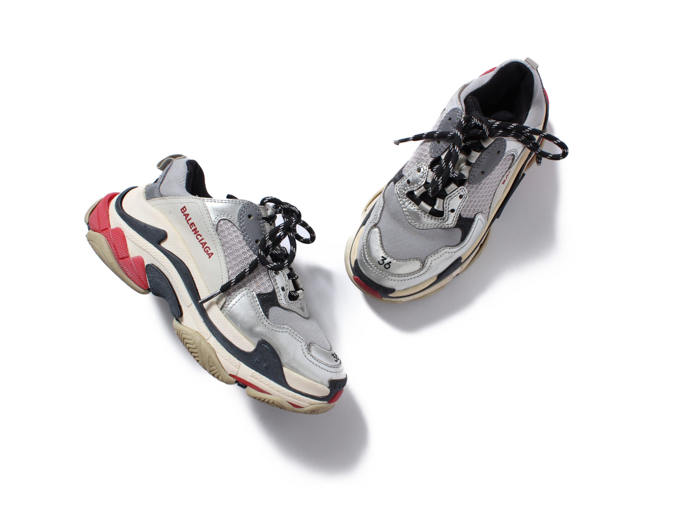 [バレンシアガ]のストリートテイストを感じられる代表アイテムの一つ。特に人気の「トリプルS」シリーズは、ランニングシューズ、バスケットボールシューズ、トラックシューズという3種類の異なるスポーツシューズのソールを組み合わせた唯一無二のデザイン。ダッドスニーカーブームの火付け役にもなりました。ゴテッとしたフォルムが足元にアクセントを加えてくれるだけでなく、どこかレトロで可愛らしい絶妙なカラーリングも魅力です。