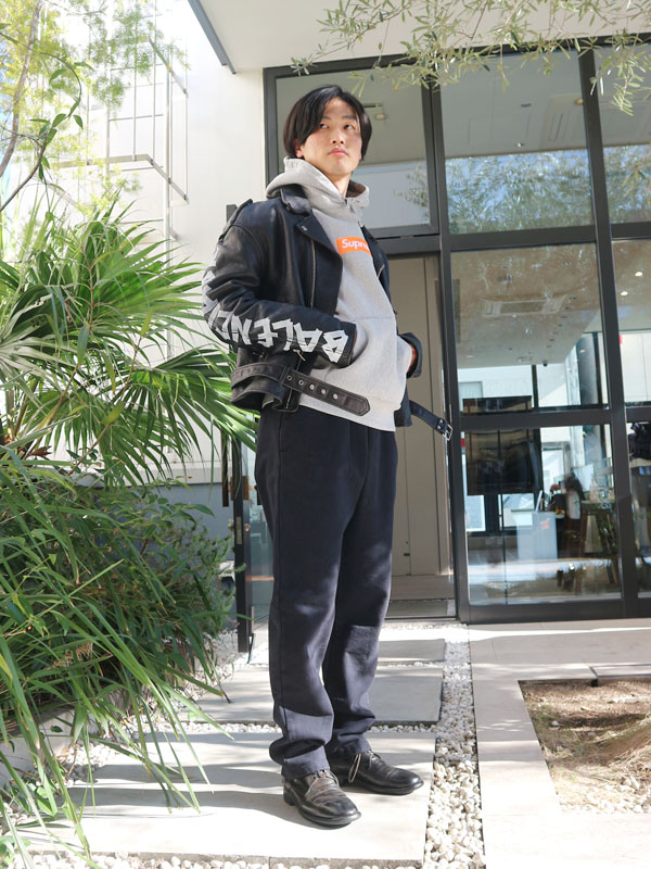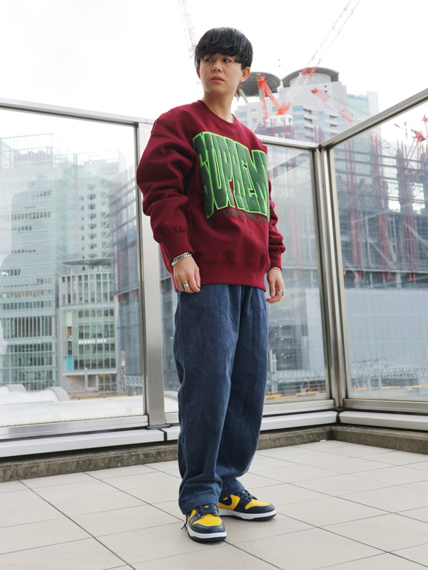 フロント部分にパイル生地で縦に大きくロゴが刺繍された[シュプリーム]のスウェットをメインにスタイリングしました。主張の強い色をふんだんに取り入れることによって、派手さをプラス。全体的にゆったりとしたサイズ感で、ストリート感溢れるラフな印象にしました。