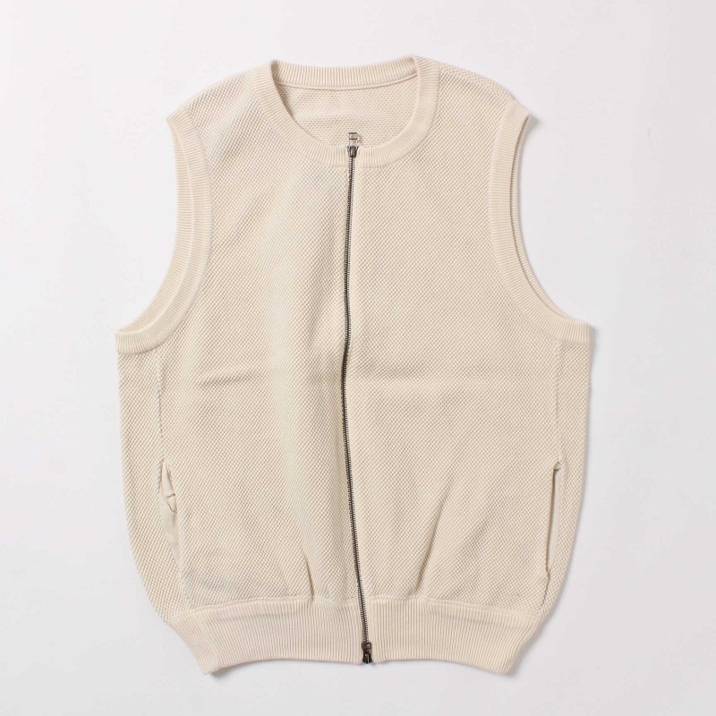 [グラウンドワイ]の変形シルエットが特徴的なニットベストをメインに、[コムデギャルソンオム]のパンツと合わせてシンプルなモードテイストにしました。まだアウターや厚手ニットは早いかなと感じる季節の変わり目でも、一枚加えるだけでガラッと雰囲気が変わるニットベストはTシャツにレイヤードしても◎。重宝すること間違いなしです。