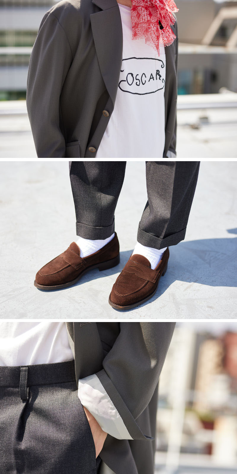 ドレスダウンとアップのバランスが他にない[トザオウ]のジャケットは使いやすさ満点。夏に後ろ髪をひかれる秋口の時期には、Tシャツと合わせたラフなスタイリングがおすすめです。首元のストールとローファーでドレッシーな要素をプラスすれば、着崩しすぎず、かつデイリーにも着られるジャケットスタイルが完成。