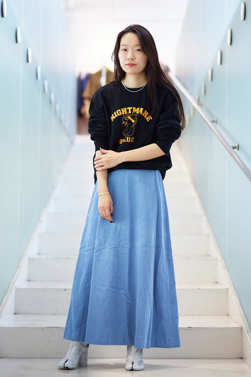 上品なAラインシルエットが魅力の[サクラ]のロングスカートは、カジュアルアイテムでこなれ感のある着こなしにするのがおすすめです。今回は[スーアンダーカバー]のロゴスウェットと合わせてコーディネート。女性らしさも残しつつカジュアルなポイントもプラスすることで、タウンユースしやすい雰囲気になります。足元は[メゾンマルジェラ]の足袋ブーツを合わせ、モードなアクセントもプラスしてみました。