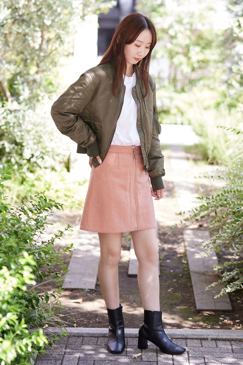 トレンドと言われつつミニ丈スカートは、なかなか着る機会や、合わせ方がいまいち…という方も多いのではないでしょうか?ポイントはトップスをどう合わせるか。今回は[マメクロゴウチ]のボリュームのあるMA-1ジャケットを合わせ、足元はあえてショート丈のブーツでまとめました。脚長効果もありスタイルよく見せてくれます。もちろん、悩んだらロングブーツを相棒にしても良いです。