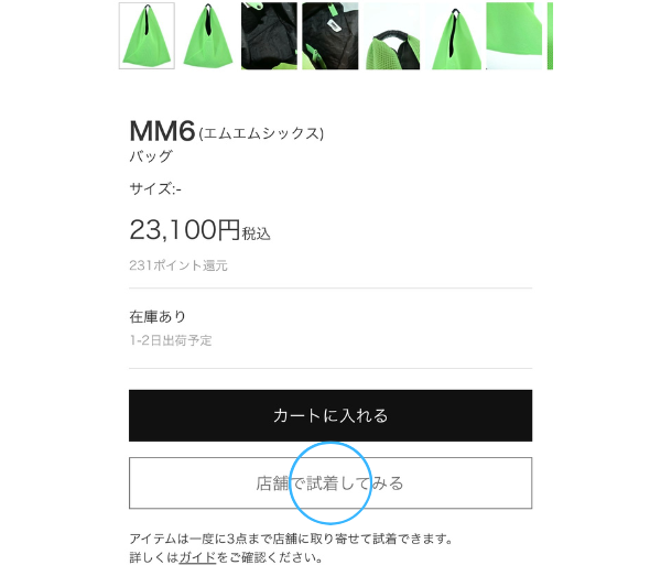 気になるアイテムの詳細ページにある「店頭で試着してみる」ボタンを押すと、お取り寄せカートに追加されます。1度に3点まで同時に追加可能です。