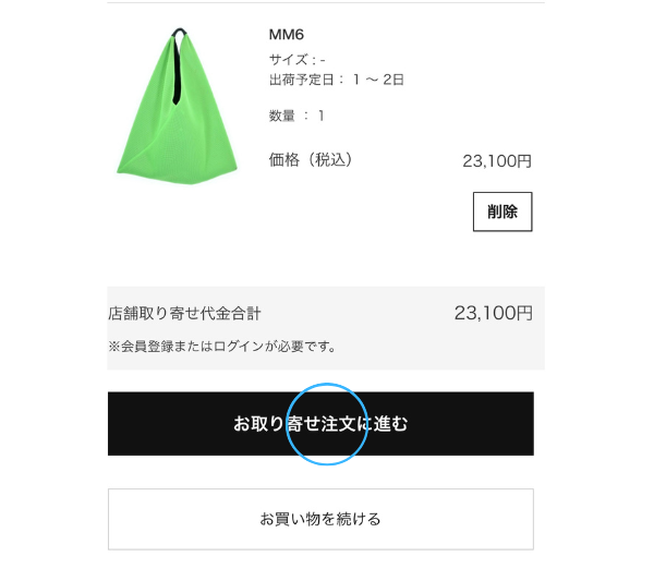 注文希望商品をカートに入れたら、「取寄申し込みに進む」をクリック。お取り寄せ注文手続きをします。お取り寄せは会員限定サービスのため、ご利用には会員登録が必要です。会員の方はログイン、会員登録がお済みでない方は、新規会員登録へお進みください。