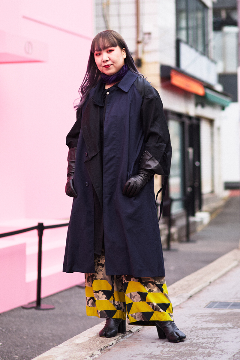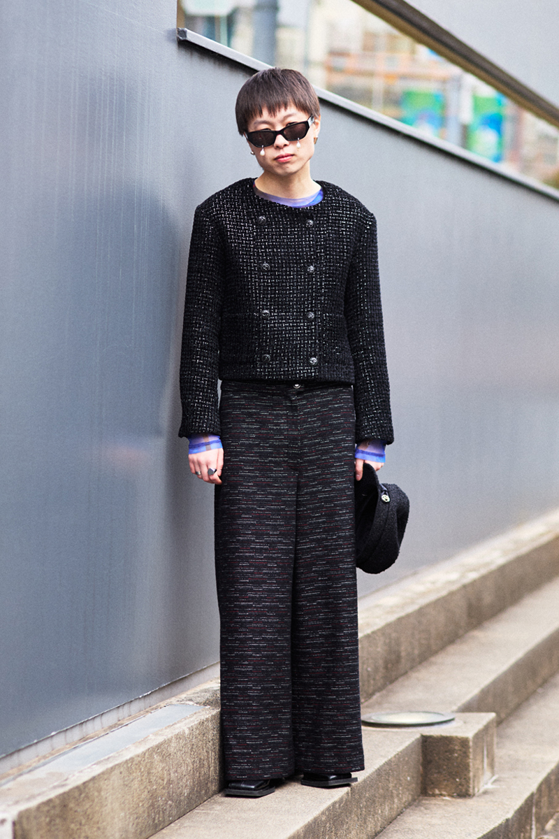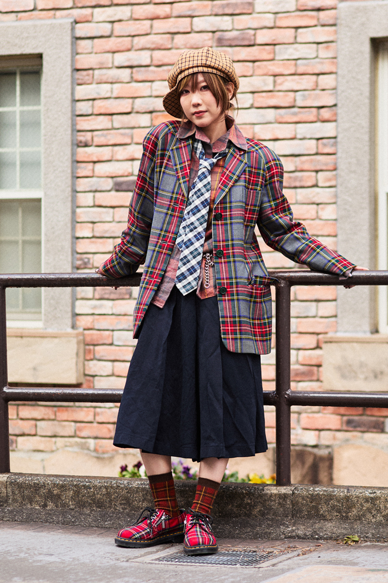 「当時社会現象となっていた音楽グループ、チェッカーズを軸にスタイリング。大ヒット曲である『ジュリアに傷心』は、私の親がよく聴いていた音楽でもあり、世代を超えて影響を感じたことから、今回は象徴的なチェック柄をメインにしました。肩パットが入っているオーバーサイズのジャケットで80年代の要素を。トラッドな印象のチェックに、反骨精神や再構築を特徴とする[コム デ ギャルソン]のアイテムを取り入れ、シルエットやバランスでモード感をプラス。音楽がファッションとして街に溶け込んでいた当時の空気感を再解釈してみたスタイリングです」
