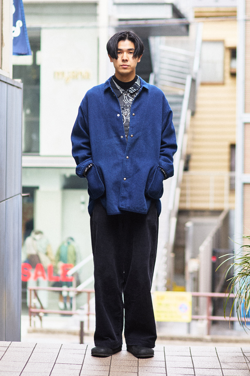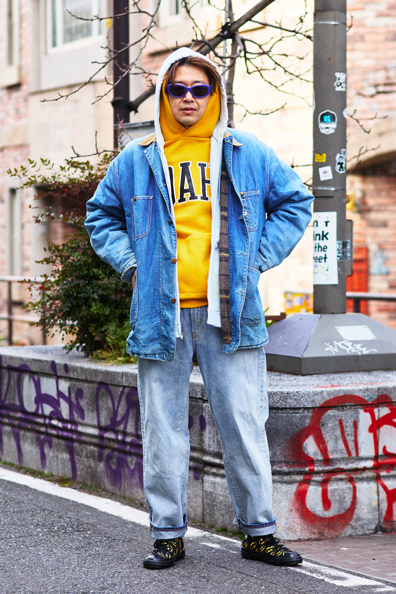 「今の自分が1985年にタイムスリップしたら、きっとこんな感じ。マイケル・ジャクソンや当時のスターのポスターを部屋に飾って、適当に大きめな服を着て、HIPHOPよろしくな感じで恰好つけて。スタイリングリソースはやっぱりアメリカ。リアルタイムにできなかった憧れの先輩像です。デニムは当時流行っていたケミカルウォッシュに近い薄い濃淡の無いブルーのセットアップ一択。足元は80年代らしいバッシュもいいけど、多分みんな履いてそうだからハズしでオタクっぽく。1985年のアメリカ映画『バック・トゥ・ザ・フューチャー』のマーティ・マクフライ、80年~90年代を代表するアメリカのホームドラマ『フルハウス』のジェシーおじさんのスタイリングはずっと意識してます」